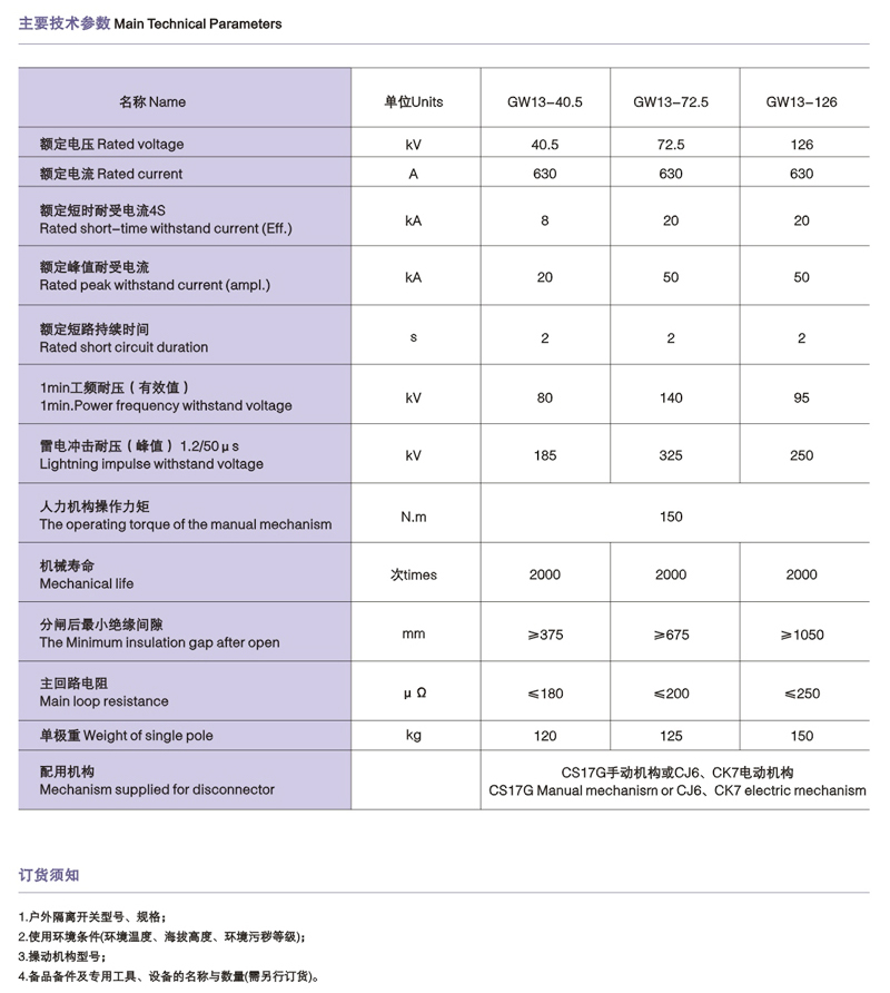 GW13-72.5隔離開關是在無載荷情況下,分何變壓器中性點聯線之用,在閘刀處于正常分閘位置時,可提供一個符合安全要求的絕緣距離。操動機構輸出軸可作180度水平旋轉,操作機構上的定位裝置能保證觸頭與靜觸頭處于正確位置或分斷位置。