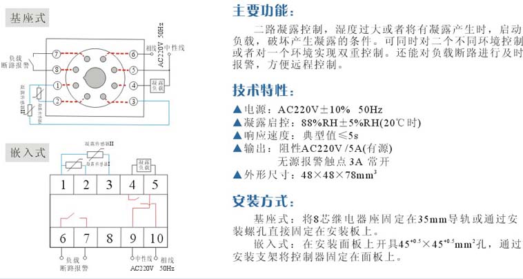 二路凝露控制,濕度過(guò)大或者將有凝露產(chǎn)生時(shí),啟動(dòng)負(fù)載,破壞產(chǎn)生凝露的條件。可同時(shí)對(duì)二個(gè)不同環(huán)境控制或者對(duì)同一個(gè)環(huán)境實(shí)現(xiàn)雙重控制