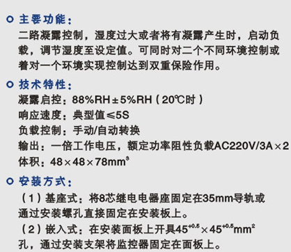 二路凝露控制,濕度過(guò)大或者將有凝露產(chǎn)生時(shí),啟動(dòng)負(fù)載,調(diào)節(jié)濕度至設(shè)定值。可同時(shí)對(duì)二個(gè)不同環(huán)境控制或者對(duì)一個(gè)環(huán)境實(shí)現(xiàn)控制達(dá)到雙重保險(xiǎn)作用。